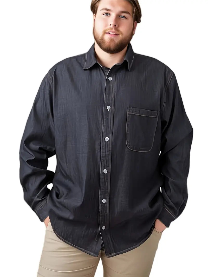 Plus Size Men's Stylish Loose Cotton Blend Solid Denim Shirt, Casual Breathable Lapel Button Up Long Sleeve Shirt For Spring Fall Outdoor Activities, Men's Clothing